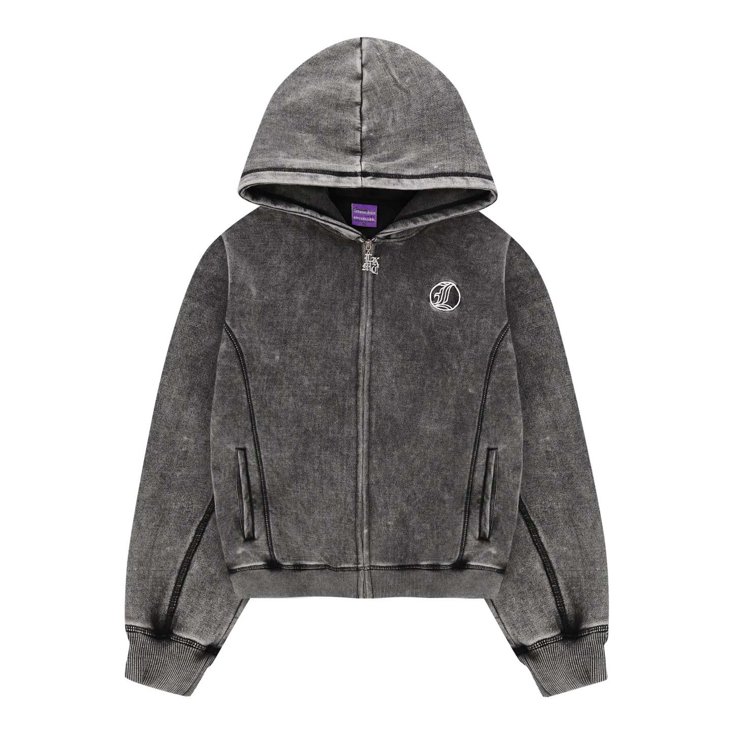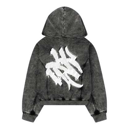 Comfortable zip up hoodie with heavy washing & big back embroidery.