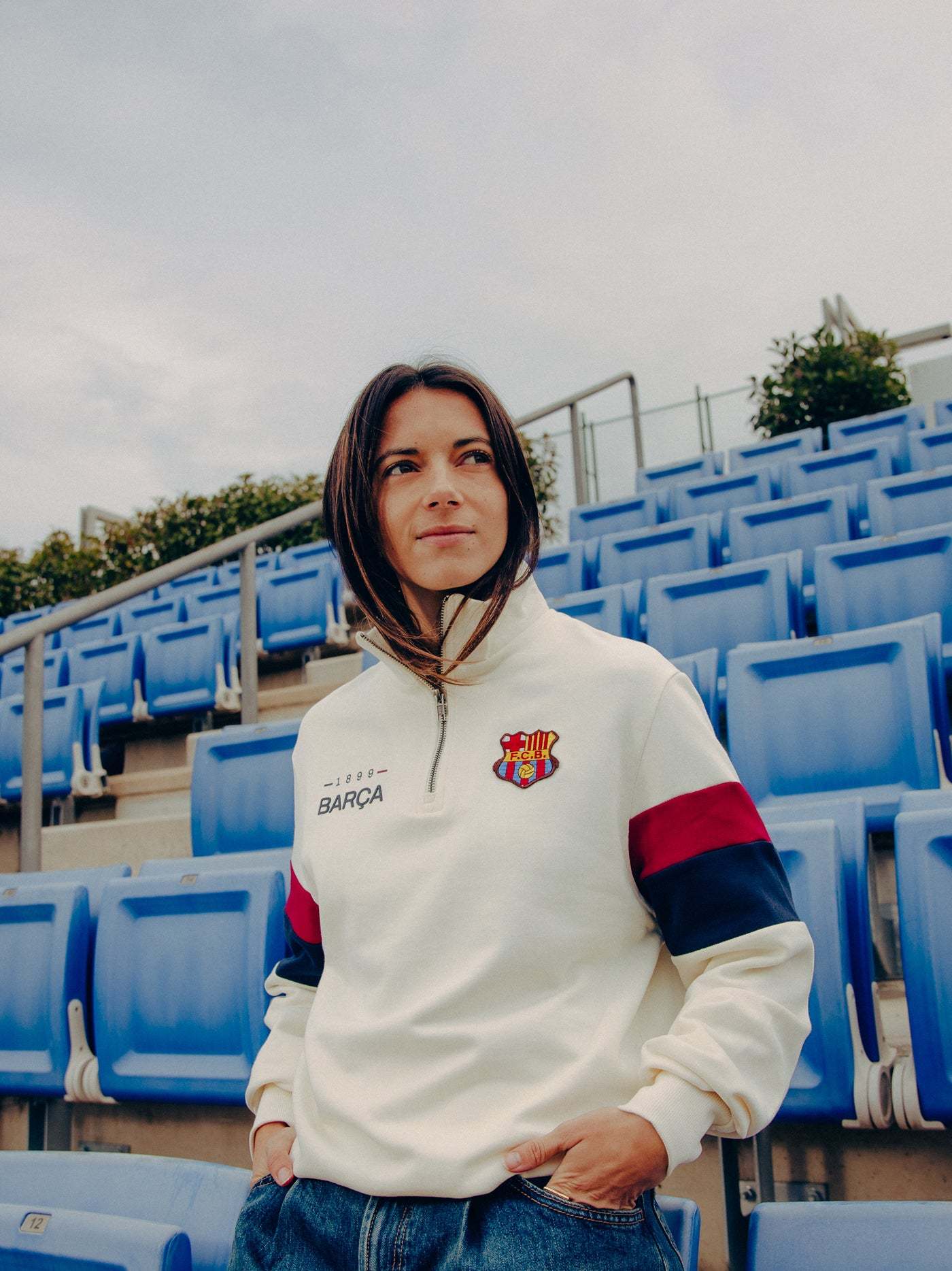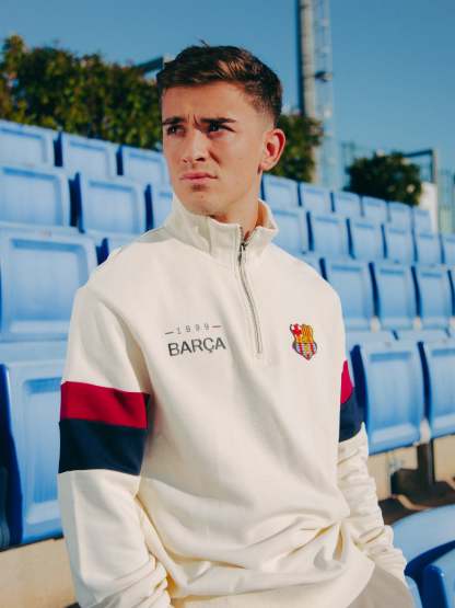 Detail of “1899” and “Barça” letters on one side and retro FC Barcelona shield embroidered on the other side. Inscription “Més que un club” embroidered on the upper back part in ecru.