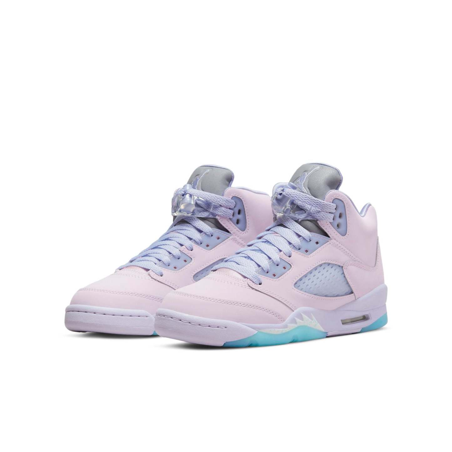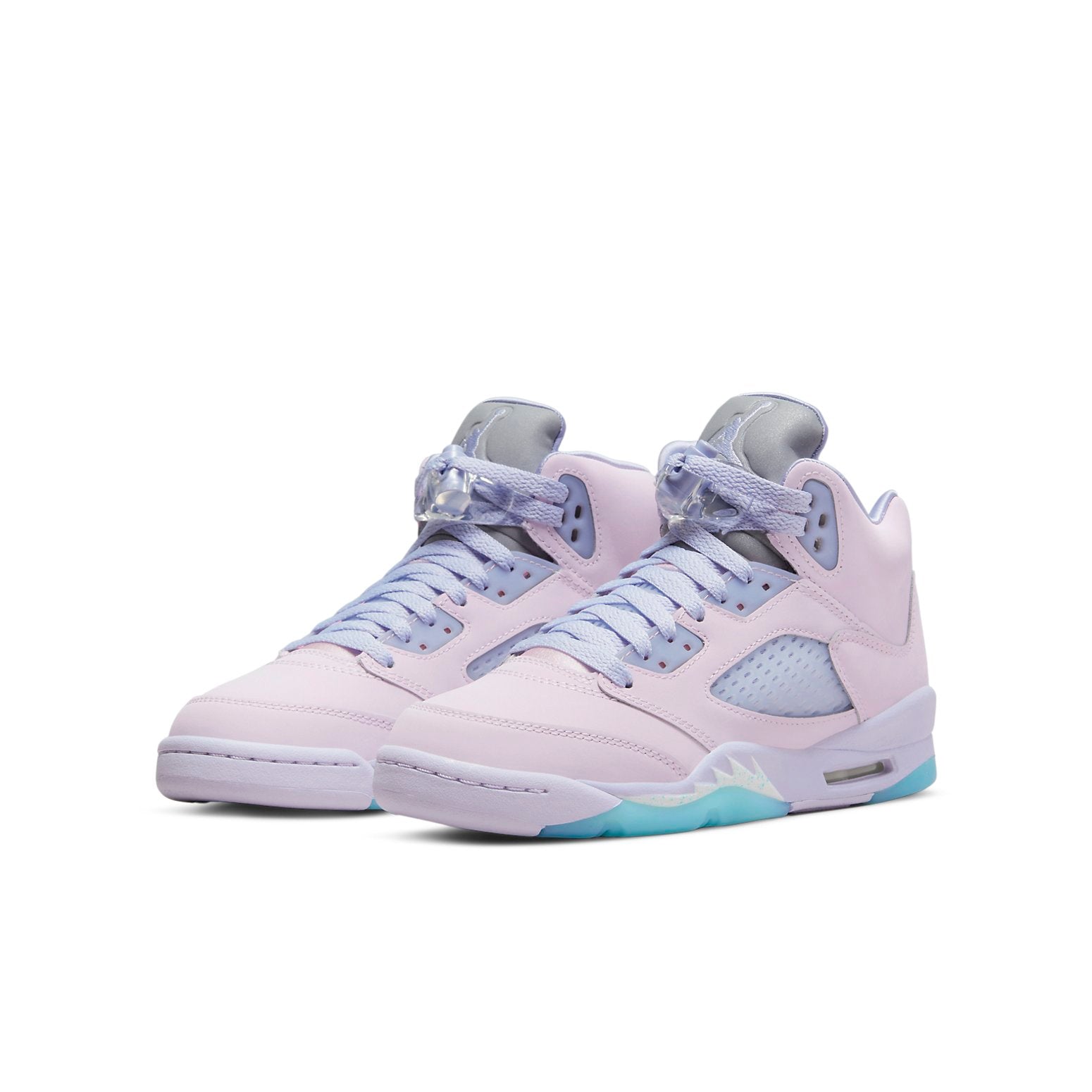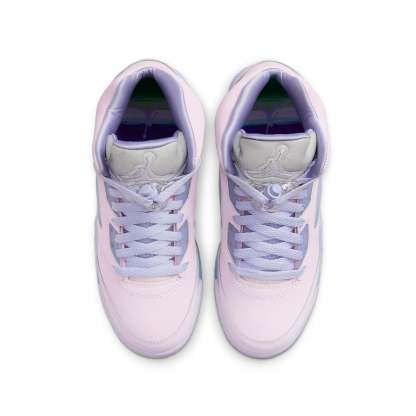 The Air Jordan 5 Retro SE GS 'Easter' is the perfect shoe for grade schoolers, packed with support and structure. A light pink leather base with blue mesh side panels and a metallic tongue featuring the iconic Air Jordan logo give these shoes a unique Easter-inspired design. The white midsole and blue outsole provide extra stability and make this model suitable for both casual wear and basketball. Don't miss out on this stylish sneaker!