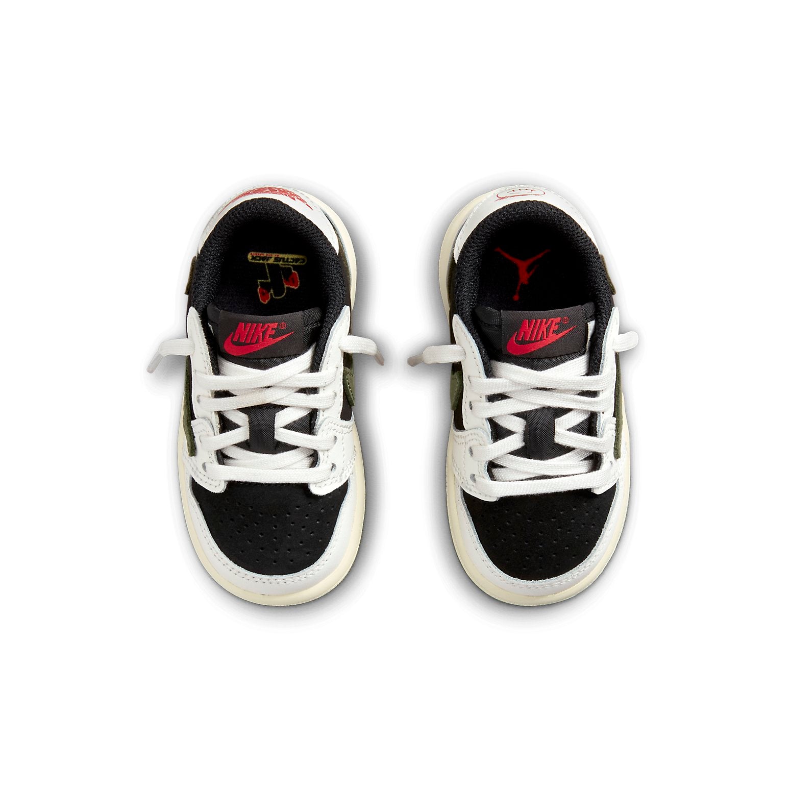 The Air Jordan 1 Retro Low OG SP 'Travis Scott Olive' is a stylish sneaker that features a signature oversized reverse Swoosh logo and olive green accents. The upper is crafted from a combination of white leather and black suede, with hits of red on the tongue label, Jumpman insole logo, and a Travis Scott badge on the heel. The midsole is finished with a subtle canvas/yellow hue and the deep olive green outsole completes the look. Perfect for any activity, this sneaker is inspired by the iconic cactus jack pattern and is sure to turn heads.